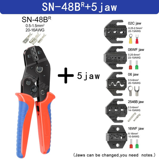 Alicate de Crimpagem multifuncional SN-48B e SN-48BS com mandíbulas para terminais e conectores do tipo Tubular/Ilhós, dupont, solar, coaxial, automotivos, pré-isolados e não isolados.